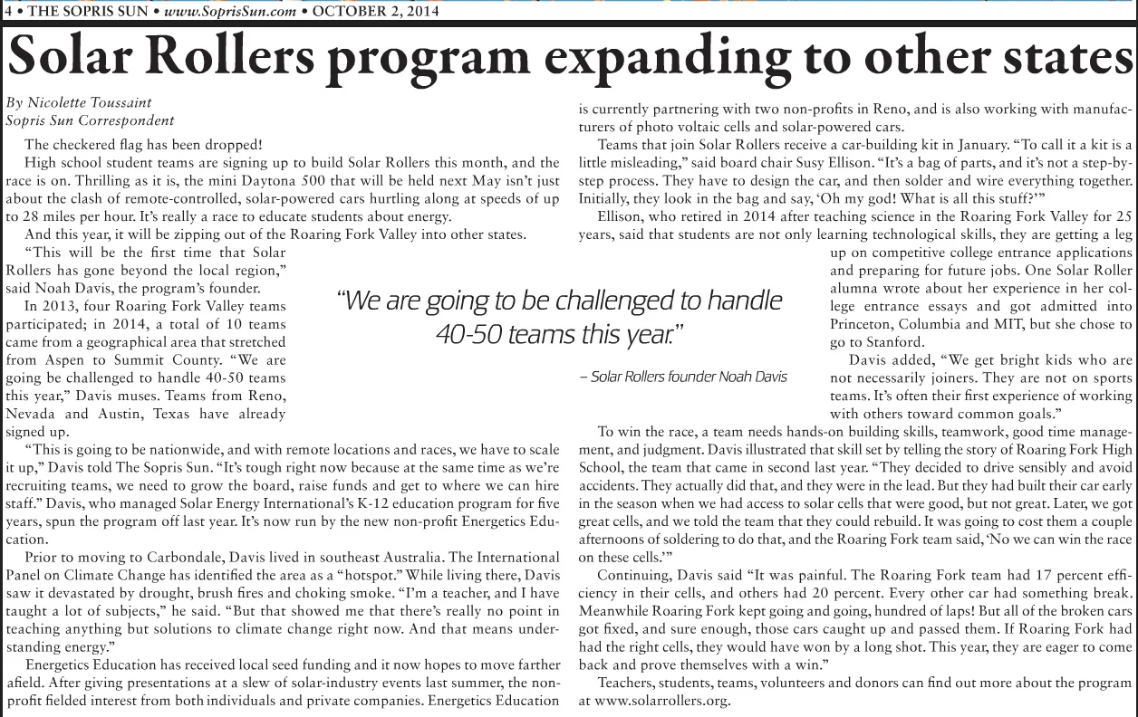 Energetics Ed is a 501c3 non-profit bringing highly engaging energy education to young people. Solar Rollers is our flagship program - high school teams building and racing sophisticated solar-powered remote-control cars.